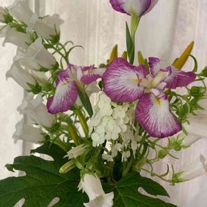 前回投稿に続き➰ 紫の花咲きました❣️ 何でしょうσ(^_^;)? 菖蒲? この形の花は難しい😅 百合も 名前教えてもらいましたが 忘れてしまい⤵️ 今日は しぼんだのをカットして蕾です カシワバアジサイの葉っぱは アクセントになりますね🎵 カンパニュラも綺麗です✨ 早いなぁ! もう6月➰今月も 皆さん よろしくお願い致します🙏🎶