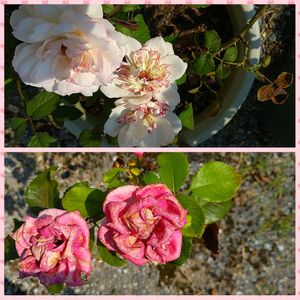 こんばんは!🌃 昨日は台風🌀のような大風で、鉢は倒れるわ、せっかく咲いたバラ🌹が枝にあたって傷だらけになるわで散々…😱 強風の中、頑張って綺麗に今春初開花した😊①あおいと、同じく頑張りはしても花びらに傷みがでた②ソワイユと③ソフィー・ロシャス😭 ④エアリエルは開ききるとかなりの大輪に!😳うっすら赤が強めのニュアンスカラーが絶妙なお色で綺麗〜✨😍✨ ⑤は、咲きそろってきたローズうらら☺️本当に花形が整ってるなぁ〜🥰 今日からまた☔が降るので、大急ぎで花カット+房咲きは枝を支柱で補強しました!…疲れた😵