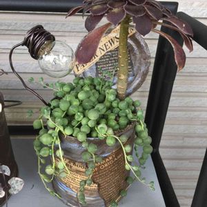 この前、作ったリメイク缶に寄せ植えしました✨ 全体を写真にのせていたので、一つ一つが分かりにくい状態だったので、ひとつずつアップしていきます。 まずひとつめはパイナップルの缶詰をリメイクしたものです。 英語の部分は折り紙を切り、まだらにライターであぶり、アンティーク感がでるようにしました。 買ってきた電球に、盆栽用の針金を巻き、飾りつけしてみました❣️ 置いている台は作れないので、ニトリで三段ラックを買ってきて、グレーにペイントしました✨