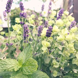 初夏と秋 2度咲くイングリッシュラベンダー⭐︎ 可愛い系のオレガノと シンプルな鉢植えに(*´꒳`*) ミント 地植えがどんどん広がるー( ˊ̱˂˃ˋ̱ ) ハーブ系は狭いお庭の南側に植えてます!