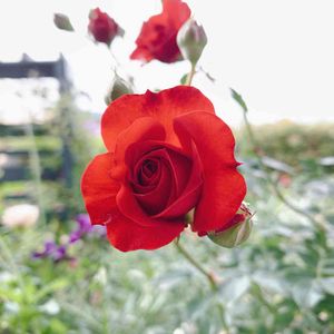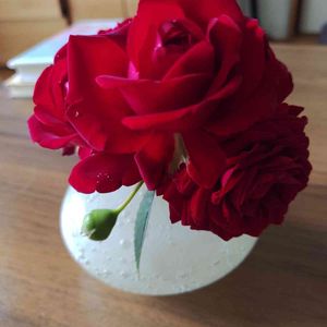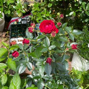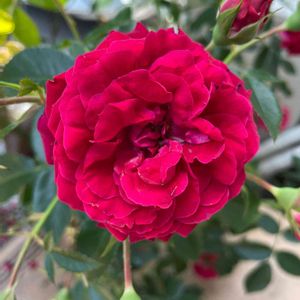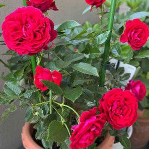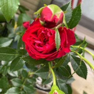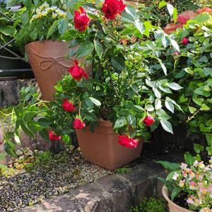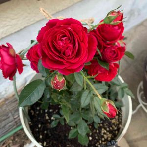 ここ数日の大雨で見頃だったバラが散ってしまったと、嘆いていらっしゃる投稿を多く見ました🥀💦 カーポート下に避難できたバラは無事でしたが、うちも散々でした😫特に地植え💦ほんと、せっかくの薔薇シーズン、残念でなりません。 皆様、めげずに頑張りましょう🥰 そんな中、小さい鉢ゆえ無事だった ✾トゥルーブルーム レッドキャプテン✾ 今年は伸びて枝垂れて咲いています。そんな姿も可愛い💖良く咲く、強い薔薇です😊