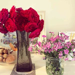 似合う花瓶がなかったのでちょっとヘンですが、バラの方は雨でうつむいてしまった細い枝を切りました✂️ ナデシコは狭い庭を占領しはじめたので、水に生けたら爽やかで涼しげでなんか良い👍