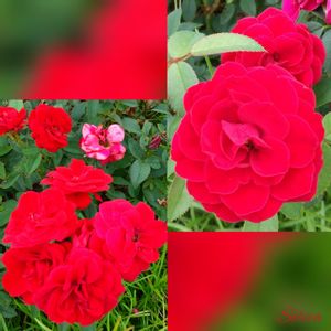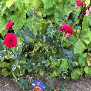 9/18 (金) ⛅ 🌹💕薔薇💕🌹 トゥルーブルーム(レッドキャプテン) True Bloomブランド ♣️光沢のあるダークグリーンの葉と深紅の花が対照的で美しく、たくさんの花が周年咲き誇る。♣️ 公園広場花壇にて、📸📱🌹