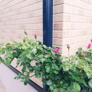 昨年玄関脇に持って来た つるバラ「パレード」 鋭い棘と戦いながら誘引した 甲斐があって今年はすごい数の蕾が