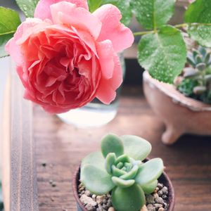 こんばんは🙂 霧雨が降っています。 多肉さんと薔薇を一緒に撮ってみました。 最近可愛くなってきたこの多肉さん。 名前を忘れてしまいました (∩´﹏`∩)