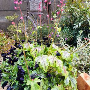 ヒューケラ とパンジー、、暴れております。可愛い鉢に植えたのですが、わかりましぇーん🤣