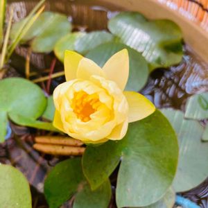 朝、睡蓮鉢に、なんと、花がー✨✨ 去年咲かず、今年もダメかなぁと思ってただけに感動ー😆 何色を買ったかわすれてたけど、キレイな黄色でした💡 全開はしていないけど、仕事に行かないといけないからこの姿しかみられていません。帰宅したら閉じていました。。