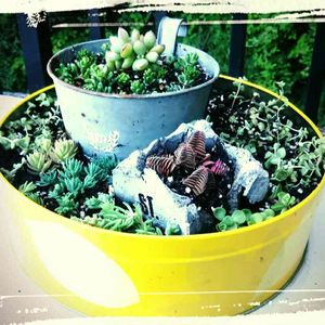 お気に入りのアルミ缶の底に穴が〰👀⚡ そしてセメント鉢も崩壊〰〰😱⚡ 両方を救うべく🌠 デカ丸缶💖に、先日譲って頂いたセダム🌵をいっぱい植えちゃいました~(*^^*)👌 ちょっとバランス悪しですが…結果オーライ😝👌