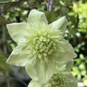 クレマチス「白万重」が咲いてます🌸 花弁中央から先進む花は‥淡黄緑色から乳白色に‥ 変化しています🪴 並んでぶら下がるお花は‥ 愛らしいです🤗💕