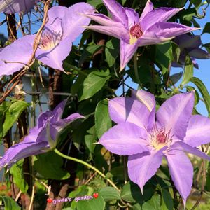 おはようございます🖐️😊🌅 クレマチスサンが、暑い中咲いています😆⤴️💓 ⬅️ユリサンの茎を支柱にしています😄 ➡️復活したHFヤングサンは、2年ぶりに会ったら色が濃くなっていました😊 👩「確か水色だったような🤔」