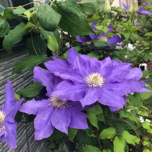 クレマチスHF.ヤング、咲き始めました💙💜🌿 四季咲きなのに秋に咲かなかったので、諦めてましたが… 昨日開花してからどんどん咲いています😃✨ まだ蕾が沢山あるので、当分は楽しめます😊🎶