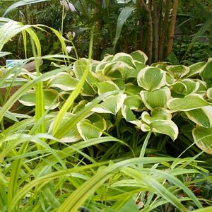 おはようございます。よく降りました。九州地方豪雨災害に遭われた方にお見舞い申し上げます。 今日はグリーンの世界です。斑入りギボウシとグラス。グラスは一昨日頂きました。涼やかさを演出してくれます。