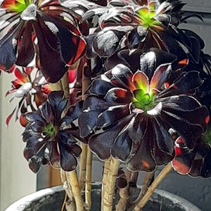 アオエニウム属 黒法師 水道水で葉水していたらカルキの跡が…!2月の寒さで葉は黒く、太陽を浴びて伸びた部分まだ緑。ちょっとずつだけど成長が目で見えて嬉しい!