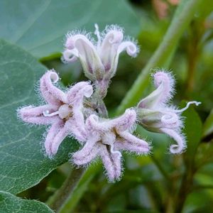今日2枚目は今年も会えた 可愛いガガイモ🌿🤍💜🤍🌿 キョウチクトウ科イケマ属の つる性多年草🌿 ①お花は直径約1㎝の薄紫色で5枚の花弁には白い毛が🤍💜🤍 真ん中の雄蕊は短筒状に合着して肉柱体(ずい柱)を作り中心から雌蕊の柱頭がニョロンと嘴状に突出てるのが可愛い🐦️ ガガイモの花には雄花と両性花の両方が存在するそうですが雌蕊(柱頭)を持つ↑この子は両性花の様です🤗 ②葉は対生して無毛🌿 全縁で長さ5~10㎝の長卵形🌿 そして根本はハート形💚 ③お花と葉っぱの大きさ対比 こんな感じのバランスです🌿 ④実は表面にいぼ状突起があり長さ約10㎝🟢 お花に比べ相当大きいからか 結実率は11%と低目です🟢 ⑤たった一度だけ出会えたケサランパサランと呼ばれる冠毛✨🤍✨ 良く見ると長い毛(種髪)を持った扁平の種が🤍⚫️🤍 🏷木曜モフモフ 🏷木曜日は桃色 🏷山野草マニア ①②③④神代植物公園植物多様性センターで🏞️ ①②③2025.7.20 ④2024.9.16 ⑤いつもの山野草で🌅2021.1.22