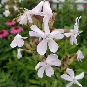 この花の名前、わかりました😊 教えていただいてありがとうございますm(_ _)m ソープワート(サポナリア)です🌸 葉っぱを水に浸して揉むと泡が出て、古くから天然石鹸として利用されていたみたいです。 ようやく花の名前がわかって嬉しいです💕 (6月18日ボランティア花壇にて)