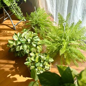 お得にゲット出来たお品、その2。 もふもふ、ボリューミーな"ネフロレピス ボストンファーン"(上側、5号吊り鉢)も同じ園芸店で、ビックリ 価格でお迎えしました👀✨ こちらもワンコインでも充分すぎるほどのお釣りがきます。 生産者さん、大丈夫かな😭って心配になりました。 かわいいツデーと一緒に…