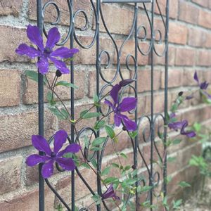 レイニーブルーのアーチをくぐったその先の2つ目のアーチには両方からクレマチスを這わせました。 右側の大河はまだ2.3個咲き始めたばかりですが左側のアフロディーテエレガフミナはたくさん咲き出しました💙 二つのクレマチスがアーチを登って出会えるのは何年後かな~?