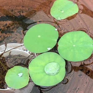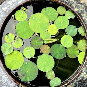 睡蓮鉢行きになった茶碗ハス😅 まんまる葉っぱがキュート❣️ 雫もいい💧