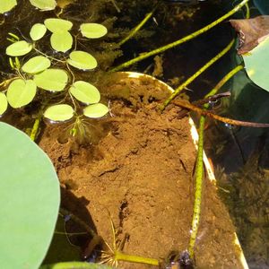 容器の底で延び放題な茶碗蓮(ハス) 蓮の葉の水滴の中にミナミヌマエビやメダカの稚魚が居たりして慌てて逃がしたり💦 アクアパッツァになるぞ🍴