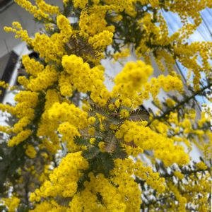 我が家の入り口の、ミモザ(銀葉アカシア)満開です💛 先日道にはみ出していた枝を5本切り取りとった後も 黄色い壁になって、道行く人たちも楽しませています🌼