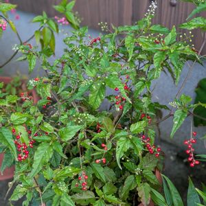 おば宅のジュズサンゴ これから実るのか黄色の実はありませんでしたが 赤とピンクは健在でした😊 種が落ちて芽が出てるのも沢山ありました🙂 我が家では☆になってしまったので連れて帰るよう言われましたがお断りしました🙂 でもどうしても連れて帰ってもらいたいらしい😔