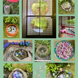 花手水 庭園の中は、山アジサイや西洋アジサイ、アナベル…たくさんのアジサイに出会います。 また、風情のある花手水もあちらこちらに✨