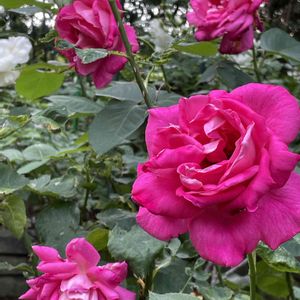 秘密の花園で最初の大輪バラ プチトリアノン 玄関前のバラピンクピースも初めて咲きました ⑤は息子夫婦からの母の日プレゼント🎁です