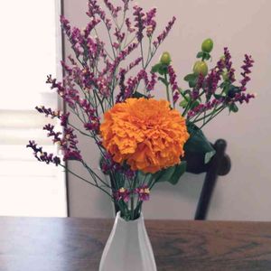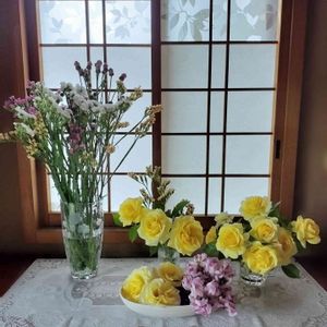 黄色いバラ、てんこ盛り? ミニバラに黒星病、また出てきてしまったので、昨日薬をかけて症状のある葉を取り、お花も減らすため少し切りました。 一つの木から取ったのは少しなんだけど、4鉢分だからこんな数に😅 茎が長く取れなかった一番花は、暴れていたキンギョソウを寝かせて飾っていたのお皿の中へ。 道の駅で買ってきたスタ−チスも一緒にパチリ📸