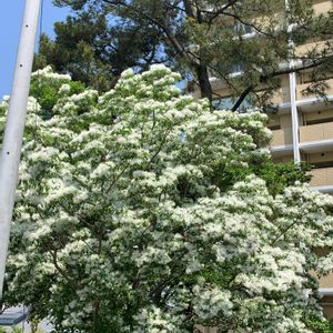 おはようございます😃 再投稿です。 私が知るヒトツバタゴの最大の木です。 毎週通う城跡の体育館の駐車場横にあります。 後ろには高層マンション、隣りは三河黒松の大木です。 こんな花の様子から、ナンジャモンジヤという変な名前が付けられたのでしょう。 もっともらしい由来。 水戸黄門で有名な水戸光圀が時の将軍から、 『なんの、ものか?(なんじゃ、もんじゃ)』 と聞かれ、『ナンジャモンジヤ?』と聞き返したのを、それを聞いた、共の者は木の名前と思ったとのこと。😅 当時、江戸にはほとんどなかった木のようです。 誰も名前が分からなかったのでしょう。 しかし、こんなユーモラスな名前で有名になった木。 今では、刈谷市では色々な場所に植えられて、親しまれています。 アオダモよりも花びらが太く、枝いっぱいに咲く花は雪が積もったようです。😘