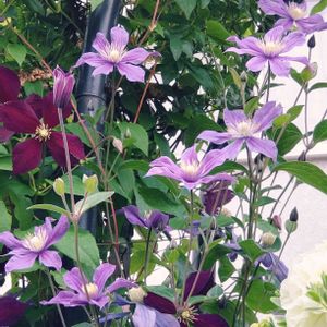 クレマチスアラベラとゴンフレナラブラブラブ 真夏で色が薄くなったアラベラですが、下からは新芽も出ています。秋になったらまたたくさん咲いてほしいな