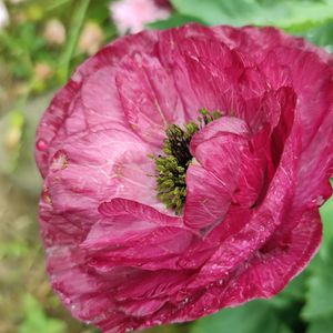 【1枚目】【2枚目】シャーレーポピーの4株目が開花しました! 今度は渋めの赤が咲きましたよー😆👍 種まきから201日目/6ヶ月と21日目。 これもパール混合からだと思います。紫がかった赤というかグレーがかった赤というか? なるほどニュアンスカラーですね👍 すごく雰囲気のある赤です。花びらが薄いからさらに不思議な色合いに見えるのかも。 すごーくカッコいいお色🥰 残念ながらオシャレでないうちには全く合わないのですが(笑)、グレーとか黒系のプランターに白い小花やカラーリーフと一緒に寄せたら素敵そう😍💕 でもこればっかりは何色が咲くかわからないから寄せ植えは博打かな? 根詰まりもするしね😅 【3枚目】昨日開花したパール混合の純白花。さすがに白花は翌日には縁が変色しちゃいますね。 昨日は気づかなかったけど、中心部に黒い模様があります。よく見たら、1〜2枚目の渋赤にも黒模様がありました。オリエンタルポピーの模様みたい😁 オリエンタルポピーも育ててみたいなー。そういえば苗で出会ったことないかも? いつ売ってるんだろう?🤔 【4枚目】同じく昨日開花したパール混合のシルバーの方は2本目も咲きました。1本目は夕方には傷んできていました。 初めに咲いたフォーリンラブミックスのオレンジ、いわゆる普通のシャーレーポピーの方は今日もまだ保っているので(3日目)、マザーオブパールは傷みやすいのか、傷みが目立ちやすいのか、長もちはしなさそうです。 【5枚目】15号に植え広げた鉢の全体像。かなり前から下葉が枯れてきていて、予想はしていましたがやはり15号でも根詰まりしてしまいました😣 これでも一度枯れ葉をむしって綺麗にしたんですが、すぐにまた目立ってきちゃいました💦 これは3株入っていますが、きっと2株でもそんなに変わらないように思えるので、15号鉢に1株植えが適切か。でもミックス種でいろんな色がみたいから株数を育てたいし、ニュアンスカラーなら色幅を楽しみたいからなおさら1色じゃつまらないし。 やっぱりシャーレーポピーの鉢栽培はこれが限界かな😮💨 ネットで画像検索すると、普通の横長プランターで育ててる方もたくさんいらっしゃって、みんな根詰まりですぐに花が終わっちゃわないのかな? とすごく疑問🤔 今回、植え広げた鉢と8号のままの鉢もあるので、まぁ自分で検証してみますわ💪😂 来年は地植え場所を確保して、鉢栽培と比較してみたいです💪 開花してきてすごく嬉しいので、今後もポピー祭りがしばらく続くと思いまーす😅