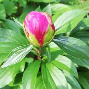 シャクヤク 開きかけに☔風に痛めつけられちょっとつかれ気味に咲いているような…