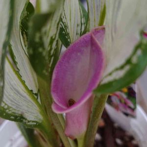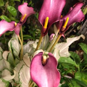 カラーの新種 💞 斑入り葉で透けてクネクネ~ お花も美しく お値段見てまたびっくり! 全く無理😭 ご好意で 撮らせて下さいました😄 行きつけもお花屋さん