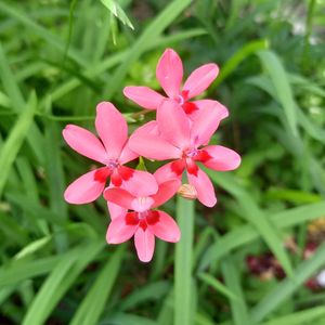 ヒメヒオウギのお花が綺麗に咲いていました。 散歩道にて 調べました。 ヒメヒオウギ(姫檜扇)の特徴 ヒメヒオウギ(姫檜扇)は、4月~5月にカラフルな色の花が咲くアヤメ科の半耐寒性の球根の花で、フリージアの仲間です。寒さにはやや弱いため温暖地なら地植え栽培が可能ですが、寒さの厳しい地域では鉢植え栽培が適しています。花色は、朱赤、ピンク濃淡、白などがあります。 ヒメヒオウギ(姫檜扇)の球根は、秋に植えると翌年の春に開花します。種からでも最短で翌年に開花します。性質がとても強くこぼれ種でも開花するほどで、コンクリートの割れ目からこぼれ種が発芽して開花している光景もよく見かけます。 名前が似ている花でヒメヒオウギスイセン(モントブレチア)がありますが、ヒメヒオウギスイセン(モントブレチア)はヒオウギズイセン属なので、植物の分類としては別のグループになります。 溢れ種で良く増えます。 白い小花が可愛いです🤍💟💕 爽やかな白いお花を見て 元気にスタート 今日も素敵な一日をお過ごし下さいね🥰