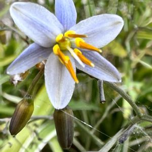 園芸関係のお仕事をなさっているご近所の方のお庭にて 花壇作りで残ったのを頂いてきたというキキョウラン 斑入りの葉に 横向き、下向きに咲く青紫色の6弁花 1cmにも満たない、小さくて地味な花ですが個性的で惹きつけられます ランの名前がつくが ススキノキ科 草姿を蘭、花の色をキキョウに例えて名付けられた 花言葉;思いがけない出会い 🏷️美しく青きドヨウ