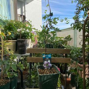 新入りのクレマチス😊 毎週のように日曜日に文京区の 音の葉 に通っています。3週間前に新たなクレマチス鉢が並んでいた中に、一際派手なお顔立ちのこれを見つけました💕 一瞬、心の中で欲しい、でも何処に置く?と自問自答し見ただけ😅 2週間前の日曜日、鉢数は減っているけどまだありました。うちにはいないタイプだし欲しいなぁと思いながら、見ただけ😅 この間の日曜日、まだありました。これは私に連れて帰ってということかと。とうとううちの子になりました❣️ 早速、深めの鉢に植替えを済ませましたので記念撮影です😊