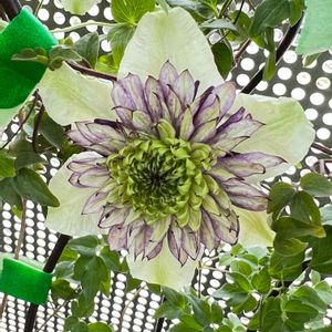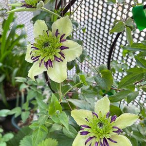 クレマチス ビエネッタ 前回投稿してから1週間、気がついたらお顔付きが変わって豪華になっていました💕 これなら、ほぼタグの写真と同じの華やかな感じです😍 フロリダ系 新旧両枝咲き 花後半分くらいの長さに剪定