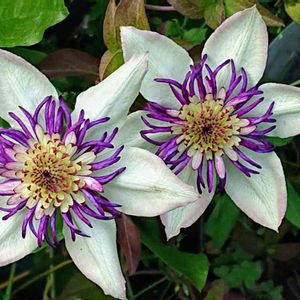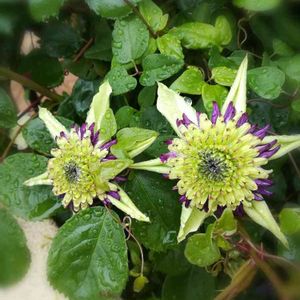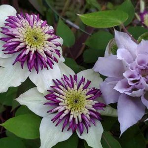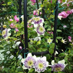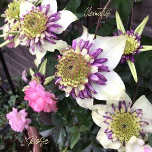 クレマチス “ビエネッタ” & “紅孔雀” ビエネッタは時計草のような花形 中心部が小菊っぽくみえるから和の庭にもしっくりくるのかな 紅孔雀は軽めの八重咲きで 一花ごとに花色が異なり その微妙さがお気に入りです