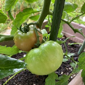 ホームセンターの 春の苗祭り🌱で 連れ帰った野菜達 トマトはまだ緑ん子だけど 大きくなって来ました❣️ 梅雨を耐えて 赤くなって美味しく なって欲しいです😊