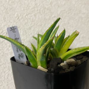 ⌘アガベの日&棘の日🌱 植物園のサボテン展でお迎えした笹の雪の黄覆輪。 こんなサイズなのにすでに脇芽がいるのがポイント👍 お迎え時は黄色がめっちゃ蛍光な感じだったのに1月で色味が薄くなりました。 やっぱし室内LEDだと光が足りんかなー🧐