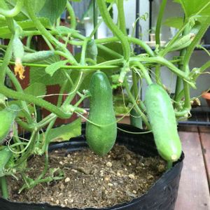 ミニきゅうり初収穫❗️収穫時期がよくわからなかったのですが、種のパッケージに載っていた写真を見ると結構小さめなので早速収穫。ちょっと太らせすぎたかな😆