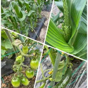 今日の畑😄 トウモロコシは雄穂が出て来ました。 間もなくと同時に奴ら(アワノメイガ)が来る⁉️ とってもアイコや、キュウリ(スティックミニ)も順調😋