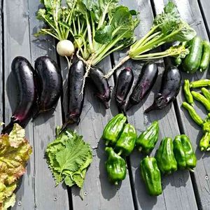 今日の収穫ー😆 たくさん採れました✌️ ナスは一番果なので小さめで収穫しときました。 スティックセニョールも真ん中の大きなものを試しに1株。 そろそろきゅうり地獄が始まりつつあります(笑)