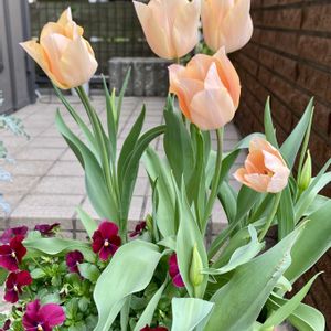 チューリップが咲きました。手前がアプリコットビューティーで、私のお気に入り。春ですね〜😊 早咲き遅咲き組み合わせて、5月まで途切れないように育てていたのですが、ここ最近の初夏の暑さで一気に全部咲きそうになっています。良いんだか悪いんだか🤔