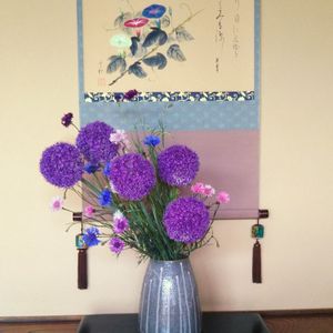 私が花を切り、家族が生けました。 アリウムをもう少し長く切れば良かったと反省…