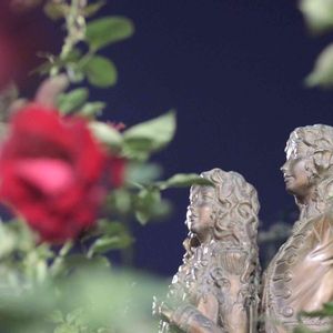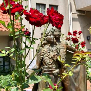 ファントムを観に、宝塚大劇場に来ています。アンドレ・オスカル像の前に真っ赤なベルばらが🌹