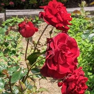 我が家の🌹薔薇の生垣 ☀️真夏の気温でもたくさん咲いてくれてます。🌹🌹🌹 昨年11月に植樹して、真紅の品種 3株とも最大樹高の1.6mに成長してくれました。