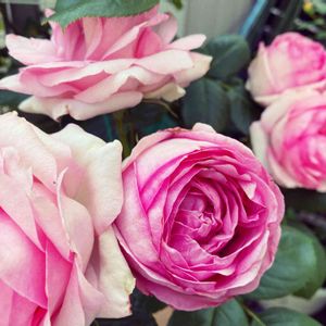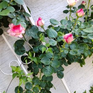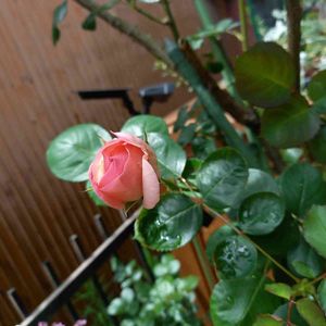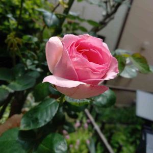 今日から梅雨入り☔ 薔薇 つるヒストリー コロッとした桃のようなピンク色のお花でかわいいです💖 咲き始めました😊 今日から☔の予報でしたが、午前中は晴れていたので、脚立に登って撮りました😄