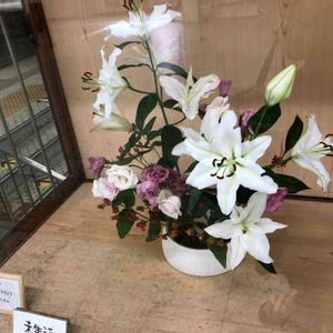 カサブランカとトルコ桔梗のアレンジ 一昨日全部つぼみだった花が、キッチンカウンターの上で開き始めました、まさに開店祝い🤣🤣🤣🤣ご報告まで。 (開花に使う水をゴクンゴクンと吸い上げてます。わたしが花器に補水する時はヨイショっと〜持ち上げてます😅💦)
