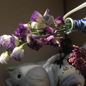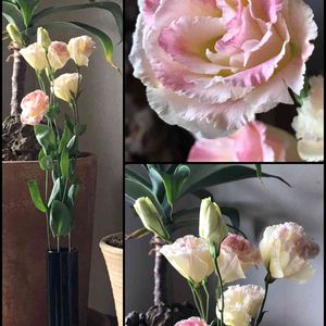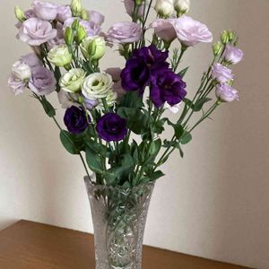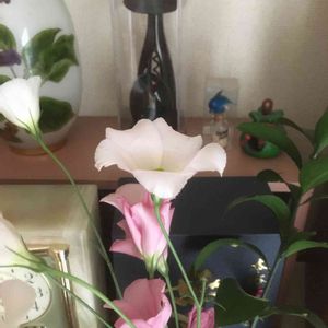 道の駅で買ったトルコ桔梗です。 お値段なんと200円でした😆 葉っぱが虫に食べられた跡のような穴が沢山あったからかな? 花は綺麗だから問題無く飾って楽しんでます💗